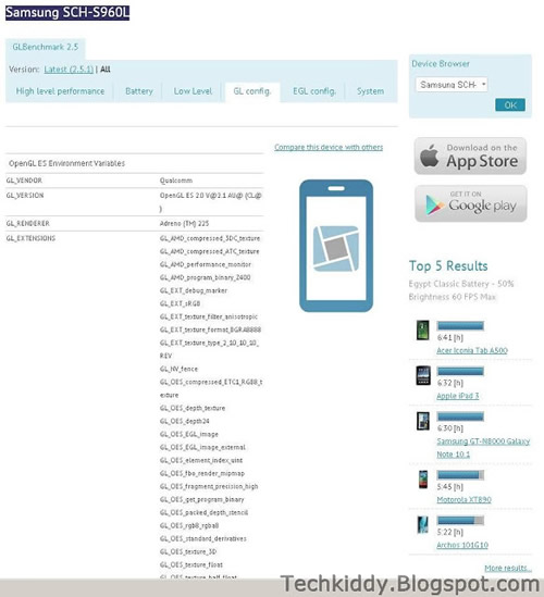 ข้อมูลจาก GLBenchmark ได้เผยรายละเอียดสเปคเครื่อง Samsung โค๊ดเนม SCH-S960L ไว้เพียงบางส่วนเท่านั้น โดยตัวเครื่องจะใช้ชิฟเซ็ตประมวลผล dual-core Qualcomm Snapdragon S4 1.5GHz มาพร้อมกับหน้าจอความละเอียด 720x1280 พิกเซล แสดงภาพกราฟฟิค Adreno 225 และรองรับระบบปฏิบัติการ Android 4.1.2 Jelly Bean