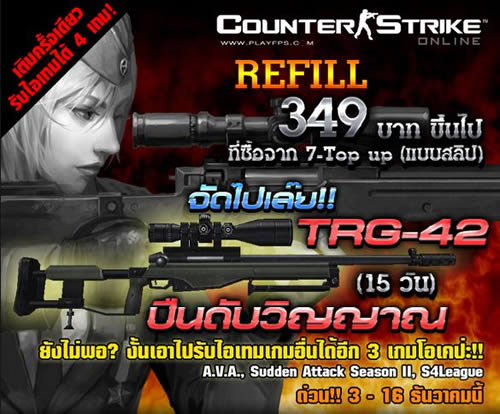 จัดหนักกว่าเดิม! กับโปรโมชั่นเกม Counter-Strike ONLINE ประจำเดือนธันวาคมนี้ เพียงเพื่อนๆ เติมเงินเกม Counter-Strike ONLINE ด้วยบัตร @cash 349 บาท ขึ้นไป ที่ซื้อจาก 7-Top Up สามารถนำมารับปืนจากเกม Counter-Strike ONLINE ได้ เท่านั้นยังไม่พอ ซีเรียลบัตรยังสามารถนำมารับไอเทมเกม A.V.A., Sudden Attack Season2 และ S4 League ได้อีกด้วย ห้ามพลาด 3-15 ธันวาคมนี้เท่านั้น
