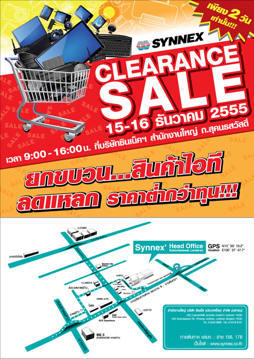 มาแล้วจ้างานลดราคายิ่งใหญ่แห่งปีที่ทุกคนรอคอย “SYNEX Clearance Sale 2012” ของบริษัท ซินเน็ค (ประเทศไทย) จำกัด (มหาชน) ผู้นำเข้าและจัดจำหน่ายคอมพิวเตอร์ อุปกรณ์ต่อพ่วงคอมพิวเตอร์ ซอฟต์แวร์ ระบบสารสนเทศ และอุปกรณ์ไอทีรายใหญ่ของประเทศไทยจัดขบวนสินค้าไอทีหลากหลายชนิดมาลดแหลกจำหน่ายราคาต่ำกว่าทุน ไม่ว่าจะเป็น พีซี, โน้ตบุ๊ค, แท็บเล็ต, กล้อง และอื่น ๆ อีกมากมาย เพื่อเป็นการคืนกำไร และขอบคุณสาวกไอทีที่ยังรักกันแน่นปึ้ก งานนี้ขาช้อปทั้งหลายเตรียมตัวเตรียมเงินกันให้พร้อมแล้วพบกันในวันเสาร์และอาทิตย์ที่ 15 - 16 ธันวาคมนี้เพียง 2 วันเท่านั้น ที่สำนักงานใหญ่ บริษัท ซินเน็ค (ประเทศไทย) จำกัด (มหาชน) ถนนสุคนธสวัสดิ์ เวลา 9.00 - 16.00 น. งานนี้ใครช้า อย่าหาว่าไม่เตือนนะจ๊ะ ถ้าช้าสินค้าอาจไม่อยู่รอให้ท่านเลือกซื้อนะจ๊ะขอบอก!