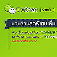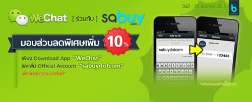 WeChat คืนกำไรสู่ผู้ใช้งาน มอบโปรโมชั่นดีๆ ส่งท้ายปีเก่า “X’mas Shopping กับ WeChat” รับไปเลยส่วนลดสูงสุด 10% บนเว็บไซต์ sabuy.com เพียงดาวน์โหลด “WeChat” แอพพลิเคชั่นลงบนสมาร์ทโฟน และสมัคร Official Account “sabuydotcom” จากนั้นส่งคำว่า “sabuycode” ระบบจะส่ง ”รหัสส่วนลดพิเศษ*” กลับมาเพื่อใช้เป็นส่วนลด 10% หรือสูงสุดไม่เกิน 500 บาท สำหรับการซื้อสินค้าทุกชิ้นบน sabuy.com เป็นของขวัญพิเศษจาก WeChat เริ่มวันนี้ ได้แล้วตั้งแต่วันนี้ถึง 25 ธันวาคม 2555