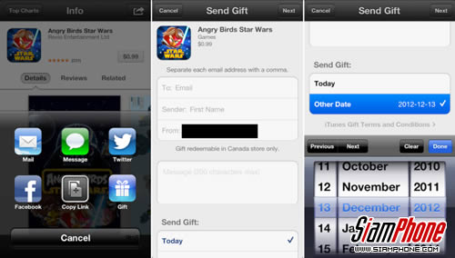 Gift ถูกนำกลับมาให้ได้ใช้งานอีกครั้งภายใน App Store บน iOS6 ซึ่งสามารถพบฟีเจอร์ดังกล่าวนี้ได้ในตัวเลือกแบ่งปันของแอพพลิเคชั่นที่มีค่าใช้จ่าย นอกจากจะสามารถส่งแอพพลิเคชั่นให้เพื่อนของคุณได้ใช้งานได้แล้ว ยังสามารถเลือกวันในการส่งล่วงหน้าได้ถึง 90 วัน พร้อมแนบข้อความหรือคำอวยพรได้ 200 ตัวอักษร แต่ขอย้ำว่าฟีเจอร์ดังกล่าวนี้เปิดให้ใช้งานในเวลาจำกัดช่วงนี้เท่านั้น