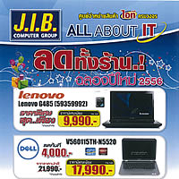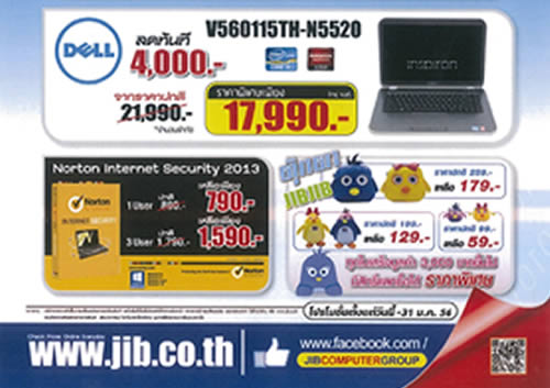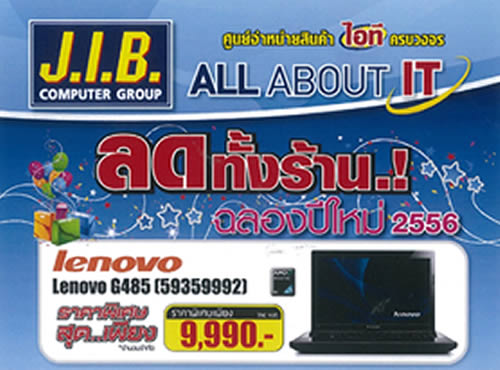 “สมยศ เชาวลิต” บิ๊กบอส บริษัท เจ.ไอ.บี. คอมพิวเตอร์ กรุ๊ป จำกัด ผู้บริหารร้านจำหน่ายสินค้าไอทีครบวงจร ภายใต้ชื่อร้าน J.I.B. จัดโปรโมชั่นใหญ่คืนกำไรส่งท้ายปีพร้อมร่วมฉลองรับปี 2556 นำสุดยอดสินค้าไอทีนานาชนิด ทั้ง โน้ตบุ๊ค (Lenovo, Dell) และ Norton internet Security 2013 ร่วมลดกระหน่ำสูงสุดกว่า 4,000 บาท และยังไม่พอเมื่อซื้อสินค้าครบทุก 3,000 บาท นำใบเสร็จแลกซื้อตุ๊กตา “จิ๊บ จิ๊บ” ในราคาพิเศษ งานนี้ใครที่มองหาอุปกรณ์ไอที แบบจ่ายในราคาสบายกระเป๋าลองแวะเข้าไปเลือกชมและซื้อสินค้าได้ที่ร้าน J.I.B. ทุกสาขาทั่วประเทศ ตั้งแต่วันนี้ถึง 31 ม.ค. 2556 หรือ สามารถอ่านรายละเอียดเพิ่มเติมได้ที่ www.fackbook.com/JIBCOMPUTERGROUP