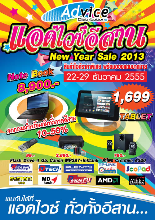แอดไวซ์เอาใจกลุ่มลูกค้าภาคอีสานมอบความสุข ส่งท้ายปี จัดโปรโมชั่นลดกระหน่ำสินค้าไอที 10-50% กับแคมเปญ “แอดไวซ์อีสาน New Year Sale 2013” มอบสินค้าไอทีราคาพิเศษ พร้อมของแถมมากมาย ให้ท่านเลือกซื้อเป็นของขวัญปีใหม่ หรือใช้งานเองก็สุดคุ้ม โดยโปรโมชั่นดังกล่าวมีกำหนดตั้งแต่วันที่ 22-29 ธันวาคม 2555 และมีสินค้าที่เข้าร่วมรายการดังนี้