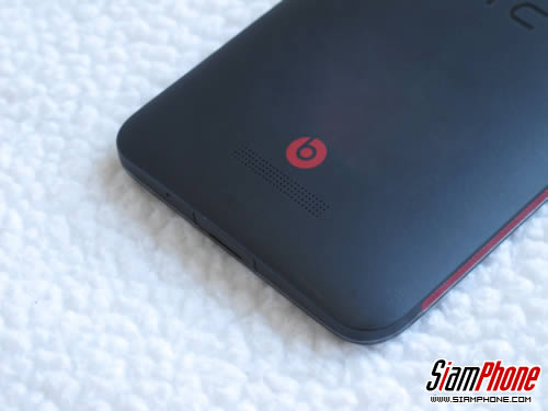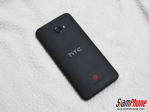 ข้างบนมีเลนส์กล้องหลังขนาดใหญ่ความละเอียด 8 ล้านพิกเซล มาพร้อมไฟแฟลชด้านขวา, ด้านซ้ายมีไฟ LED ออกมาจากช่องเล็กๆ ที่จัดเรียงกันเป็นวงกลม ถัดลงมาตรงกลางฝาหลังมีโลโก้ HTC สีเดียวกับฝาหลัง ด้านล่างมีโลโก้ Beats Audio และช่องลำโพง