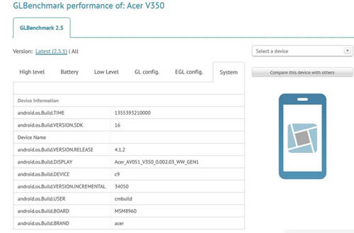 เมื่อเร็วๆ นี้ Acer เพิ่งโชว์ Acer V360 สมาร์ทโฟนรันบนระบบปฏิบัติการแอนดรอยด์ 4.1 Jelly Bean มีหน้าจอกว้าง 4.5 นิ้ว และตามด้วย Acer Iconia Tab B1 แท็บเล็ตหน้าจอกว้าง 7 นิ้ว ล่าสุดมีแหล่งข่าวจากเว็บไซต์ GLBenchmark ได้เผยรายละเอียดผลการทดสอบฮาร์แวร์ของสมาร์ทโฟนอีกหนึ่งรุ่นที่คาดว่าจะได้รับการเปิดตัวในงาน CES 2013