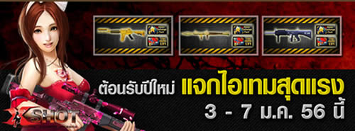 สวัสดีงชาว XSHOT ทุกท่าน ต้อนรับสัปดาห์ส่งท้ายปีทางทีมงานได้ทำการแจกไอเทมเฉพาะปืนกลเท่านั้นนะครับ มันส์กระจุย ยิงกระจายแน่นอน ง่ายๆ เพียงแค่ล็อกอินเข้าเกมตั้งแต่วันที่ 3 - 7 ม.ค. 56 ตั้งแต่เวลา 11.00 น. - 21.00 น. รับรองแรงกระจาย ทีมงานยังแถมการ์ดออนไลน์ทุกวันให้ไปปั้มเลเวลกันให้กระจายไปเลย