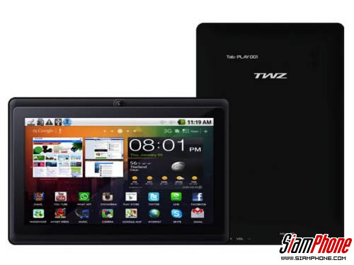 TWZ Tab PLAY001 มาพร้อมกับระบบปฏิบัติการณ์ Android 4.0.4 Ice Cream Sanwich หน้าจอ TFT-LCD ขนาด 7 นิ้ว ระบบสัมผัสมัลติทัช ความละเอียด 800x480 พิกเซล หน่วยประมวลผลความเร็ว 1 GHz แรม 512 MB หน่วยความจำตัวเครื่อง 4 GB เพิ่มเติมการ์ดหน่วยความจำ microSD สูงสุด 32 GB รองรับการเชื่อมต่อ Wi-Fi, Mini USB OTG 2.0, ช่องต่อหูฟังขนาด 3.5 มิลลิเมตร