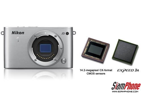 Nikon เปิดตัวกล้อง Mirrorless เปลี่ยนเลนส์ได้รุ่นใหม่ล่าสุด Nikon 1 J3 ออกแบบมาให้มีความเรียบหรู ทันสมัย ขนาดกะทัดรัด ตัวเครื่องทำมาจากเมทัลลิคมีขนาด 101 x 60.5 x 28.8 มิลลิเมตร น้ำหนักรวมแบตเตอรี่ 244 กรัม มาพร้อมกับเซ็นเซอร์ CMOS รูปแบบ CX ความละเอียด 14.2 ล้านพิกเซล หน้าจอ LCD 921k-dot ที่ให้มุมมองได้กว้างขึ้นกว่ากล้องดิจิตอล Nikon 1 รุ่นอื่น และแฟลช i-TTL ซึ่งสามารถเปิดขึ้นอัตโนมัติเมื่อต้องการแสงเพิ่ม
