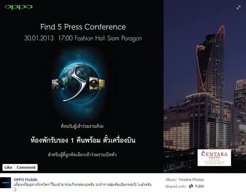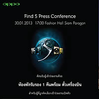 ในที่สุดความหวังที่ทุกคนรอคอยก็มาถึง เมื่อ OPPO ได้ประกาศออกมาว่าจะมีงานเปิดตัว Find 5 ที่มีหน้าจอ 5 นิ้ว คมชัดระดับ Full HD 1080P ขึ้นในวันที่ 30 มกราคมนี้ ณ Fashion Hall Siam Paragon ผ่านทาง Facebook Fanpage และยังให้สิทธ์สุดพิเศษสำหรับสำหรับแฟนๆมีสิทธิ์เข้าร่วมในงานเปิดตัวในครั้งนี้ ยิ่งไปกว่านั้นสำหรับผู้โชคดีที่ได้รับรางวัล ทางออปโป้เค้ายังใจดีออกค่าที่พักสุดหรู ณ Centara Grand Hotel @ CentralWorld พร้อมตั๋วเดินทางให้แก่ผู้ที่มีสิทธิ์เข้าร่วมกิจกรรม
