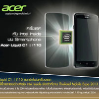 - Acer Liquid C1 สมาร์ทโฟนพลัง Intel® AtomTM processor Z2420 เครื่องแรกของโลก ความเร็ว 1.2 GHz Hyper Threading ที่ให้ความเร็ว แรง ในการเข้าถึงแอพ แชท แชร์ได้เร็วกว่าที่เคย หน้าจอ LCD Touch 4.3 นิ้ว IPS ความละเอียด qHD 960x540 พิกเซล ระบบปฏิบัติการแอนดรอยด์ 4.0 (พร้อมอัพเกรดเจลลี่บีนเวอร์ชั่น) หน่วยความจำ ROM 4 GB และ RAM 1GB กล้องหลัง 8 MP AF&LED อิสระในการเชื่อมต่อ 3G ได้ทุกเครือข่ายบนความเร็ว 21 Mbps แบตเตอรี่ 2000 mAh ให้ความต่อเนื่องในการใช้งานได้ถึง 9 ชั่วโมง Acer Liquid C1 ราคาขายเครื่องละ 9,990 บาท (ราคารวมภาษีมูลค่าเพิ่ม) * สิทธิพิเศษสำหรับลูกค้าที่เป็นเจ้าของ Acer Liquid C1 ในงาน Thailand Mobile Expo 2013 รับฟรีทันที ฟิลม์กันรอย, Intel Bunny Man และ พร้อมแบตเตอรี่สำรอง (Power Bank) ขนาด 4,400 mAh รวมมูลค่าก่วา 2,000 บาท และ Kaspersky Mobile Security for Android Full License 6 months