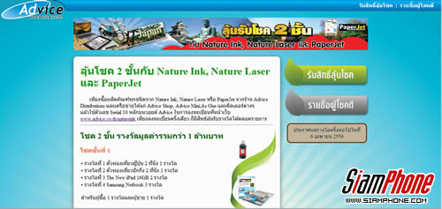 แอดไวซ์ ส่งโปรโมชั่นพิเศษ สำหรับลูกค้าที่ซื้อผลิตภัณฑ์ทุกชนิดจาก Nature Ink, Nature Laser หรือ PaperJet จากร้านแอดไวซ์ ดิสทริบิวชั่น (Advice Distributions) และร้านเครือข่าย ได้แก่ Advice Shop, Advice Mini, As One และดิลเลอร์ต่างๆ เพียงนำตัวเลขซีเรียลนัมเบอร์ (Serial Number: SN) 10 หลักบนใบเสร็จ (วอยด์ Advice) มาลงทะเบียนที่หน้าเว็บ www.advice.co.th/natureink โดยลงทะเบียนเพียงครั้งเดียว ก็ได้สิทธ์ลุ้นรับรางวัลตลอดรายการ หมดเขตร่วมชิงโชค 30 มิถุนายน 2556