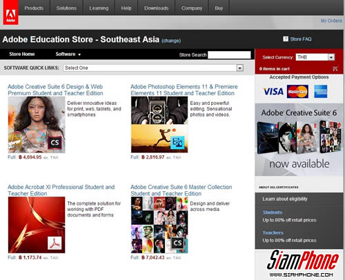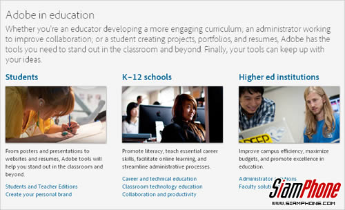 อะโดบี ซิสเต็มส์ ได้เปิดตัว Education Store เพื่ออำนวยความสะดวกให้แก่นักเรียนและอาจารย์ในประเทศไทยในการซื้อผลิตภัณฑ์ด้านการออกแบบและสร้างสรรค์ของอะโดบี เช่น โปรแกรม Photoshop, InDesign และ Acrobat พร้อมรับส่วนลดสูงสุดถึง 80% ซึ่งผลิตภัณฑ์ทั้งหมดมีจำหน่ายทั้งในรูปแบบการดาวน์โหลดและรูปแบบกล่อง