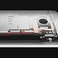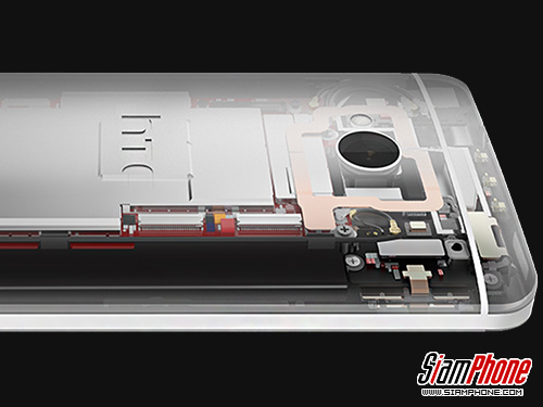ภาพเอ็กซ์เรย์ด้านหลังของ the new HTC One สำหรับรุ่นนักพัฒนาด้านหลังจะใช้เป็นอลูมิเนียมสีเงินในการผลิต