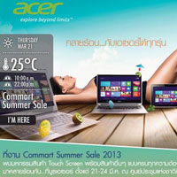 บริษัท เอเซอร์ คอมพิวเตอร์ จำกัด จัดโปรโมชั่นสุดพิเศษรับลมร้อนครั้งแรกของปี เปิดประสบการณ์แห่งยุคของ Touch Screen ด้วยนวัตกรรมหน้าจอสัมผัส อาทิ Notebook, Ultrabook, Tablet และ Smartphone นำทัพด้วย Acer Aspire S7 Touch Ultrabook, Acer Aspire V5 Slimnote, Acer ICONIA W510 Windows 8 Tablet และ Liquid C1 | I110 สมาร์ทโฟนเครื่องแรกที่มาพร้อมขุมพลัง Intel Inside® พร้อมโปรโมชั่นสุดพิเศษกับส่วนลดถึง 50% และลุ้นรับเครื่องฟรีไปเลยทันทีกับแคมเปญ “เครื่องนี้ ฟรี หรือ จ่าย” พร้อมโปรโมชั่นสุดคุ้ม ราคาสุดฮอทอื่นๆ อีกมากมายได้ในงาน COMMART SUMMER SALE 2013 ระหว่างวันที่ 21-24 มีนาคม 2556 ณ ศูนย์ประชุมแห่งชาติสิริกิตติ์