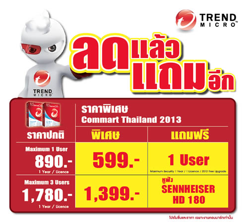 และพิเศษสุดสำหรับลูกค้าที่แสดงสติกเกอร์สำหรับอุปกรณ์แท็บเล็ตและมือถือสมาร์ทโฟนที่ได้รับประกันจากซินเน็ค รับฟรีทันทีโซลูชั่นรักษาความปลอดภัยสำหรับมือถือ (อินเทอร์เน็ต โมบาย ซิเคียวริตี้) จำนวนจำกัด 100 คนต่อวัน พร้อมเชิญร่วมสนุกกับกิจกรรมและลุ้นรับของรางวัลมากมายที่บูธเทรนด์ไมโคร ห้องเพลนารี ฮอลล์ ในงานคอมมาร์ต ไทยแลนด์ 2013 ระหว่างวันที่ 21 - 24 มีนาคม 2556 ณ ศูนย์การประชุมแห่งชาติสิริกิติ์ ข้อมูลผลิตภัณฑ์เพิ่มเติมคลิกดูได้ที่ www.trendmicro.com
