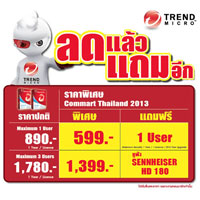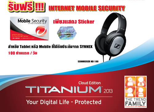 บริษัท เทรนด์ไมโคร (ประเทศไทย) จำกัด พร้อมรุกตลาดคอนซูเมอร์จัดโปรโมชั่นพิเศษสุดคุ้ม สำหรับลูกค้าที่ซื้อโซลูชั่นไททาเนียม แม็กซิมั่ม ซิเคียวริตี้ 2013 สุดยอดโปรแกรมรักษาความปลอดภัยที่จะช่วยปกป้องคุณจากภัยคุกคามออนไลน์ต่างๆ เมื่อซื้อไททาเนียม แม็กซิมั่ม ซิเคียวรตี้ สำหรับ 3 ไลเซนส์ เลือกใช้ได้ทั้งวินโดว์ส แม็คโอเอส หรือแอนดรอยด์ ราคาพิเศษ 1,399 บาท พร้อมรับฟรีทันทีหูฟังสุดหรูยี่ห้อ Sennheiser รุ่น HD180 มูลค่า 800 บาท และเมื่อซื้อไททาเนียม แม็กซิมั่ม ซิเคียวริตี้ สำหรับ 1 ไลเซนส์ ราคาพิเศษ 599 บาท แถมฟรีสิทธิ์ใช้งานฟรีทันทีอีก 1 ไลเซนส์