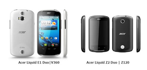 บริษัท เอเซอร์ คอมพิวเตอร์ จำกัด เปิดตัวสมาร์ทโฟนระบบแอนดรอยด์ 2 รุ่น ราคาโดนใจ Acer Liquid E1 Duo| V360 สมาร์ทโฟน 2 ซิม ซาวด์กระหึ่ม เพื่อความบันเทิงสุดคุ้ม และ Acer Liquid Z2 Duo | Z120 สมาร์ทโฟนระบบ 2 ซิม ราคาประหยัด สำหรับผู้ที่ต้องการเปลี่ยนจากฟีเจอร์โฟนมาใช้แอนดรอยด์โฟนเพื่อรองรับไลฟ์สไตล์ปัจจุบัน