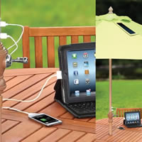 ร่มกันแดดสนามพร้อมแผงโซล่าร์เซลล์ อาจจะเป็นคำตอบหนึ่งสำหรับฤดูกาลที่เต็มไปด้วยแสงแดดเช่นนี้ ซึ่งไม่เพียงช่วยบังไม่ให้แสงแดดและความร้อนเข้าสู่เราโดยตรงแล้ว ยังมาพร้อมคุณสมบัติพิเศษจากแผลโซล่าร์เซลล์บนผืนร่ม ที่ช่วยเปลี่ยนพลังงานแสงอาทิตย์กลายเป็นพลังงานไฟฟ้าสำหรับชาร์จไฟให้กับแบตเตอรี่ของอุปกรณ์สมาร์ทดีไวซ์ต่างๆ ผ่านช่องเชื่อมต่อ USB 2 พอร์ต ที่บริเวณเสาร่ม พร้อมสำรองพลังงานได้ 3.7-volt/1000mA แม้ในขณะมีเมฆมาก