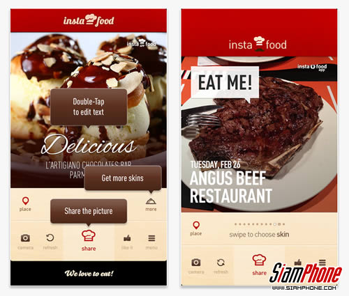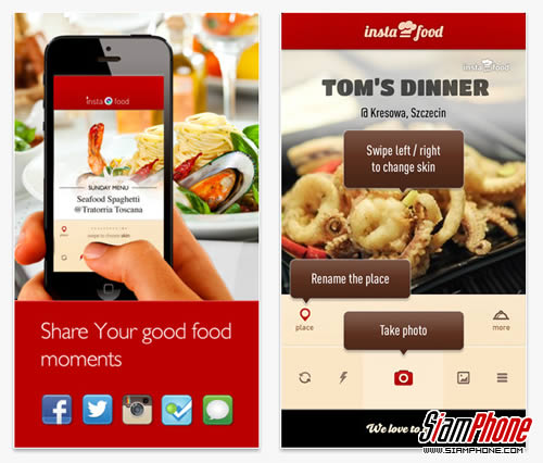 InstaFood แอพพลิเคชั่นต่อยอดจากผู้พัฒนาแอพฯ Instaplace และ Instaweather คราวนี้เป็นแอพฯ สำหรับถ่ายรูปอาหาร พร้อมสามารถระบุสถานที่ หรือร้านอาหารลงในรูป เพิ่มความน่าทานมกายิ่งขึ้น อีกทั้งยังสามารถแชร์ภาพอาหารมื้ออร่อยของคุณให้เพื่อนๆ ได้ชมกันบน Instagram, Facebook, Twitter และอื่นๆ