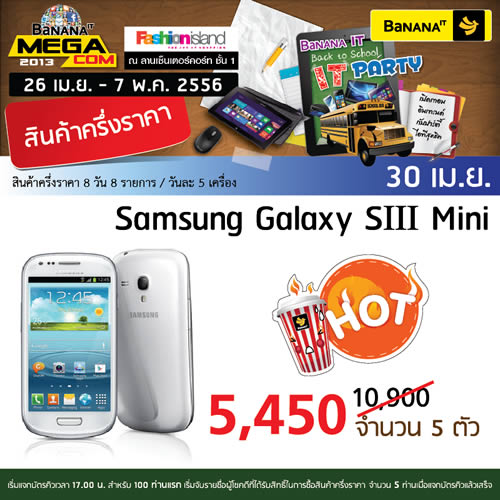 ช้อปปิ้งฉลองวันส่งท้ายเดือนเมษายน และวันหยุดชดเชยวันแรงงานแห่งชาติ พร้อมรับโปรโมชั่นสุดพิเศษ ที่งาน BaNANA IT Megacom 2013 ศูนย์การค้า แฟชั่นไอส์แลนด์ สุดพิเศษ วันนี้ (30 เม.ย.) พบกับสินค้าครึ่งราคาลด 50 % Samsung Galaxy SIII Mini จากปกติราคา 10,900.-บาท เหลือเพียง 5,450.-บาท จำนวน 5 เครื่อง พร้อมโปรโมชั่นสินค้านาทีทองลดสูงสุด 80 % เป็นประจำทุกวัน มากกว่า 10 รายการ วันละ 2 รอบ (12:30/15:30) อาทิ พริ้ตเตอร์ Epson รุ่น L110 จากราคาปกติ 3,990.-บาท เหลือเพียง 1,990.-บาท และ กล้องดิจิตอล Sony รุ่น DSC-W630 ปกติราคา 3,900.-บาท เหลือเพียง 2,490.-บาท