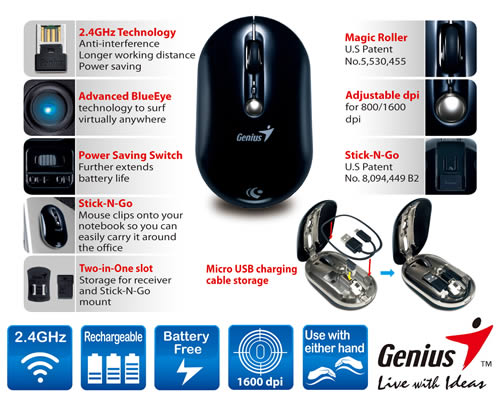 สัมผัสประสบการณ์เมาส์ไร้สายที่เป็นมิตรกับสิ่งแวดล้อมในผลิตภัณฑ์ Genius ตระกูล ECO – NX-ECO เป็นเมาส์ไร้สายแบบ BlueEye ที่เน้นความเป็นมิตรกับสิ่งแวดล้อมและมาพร้อมกับจุดขาย “ไม่ต้องใช้แบตเตอร์รี่” ด้วยการดีไซน์แบบไร้แบตเตอร์รี่ เพียงแค่เสียบสายชาร์จ USB เข้ากับคอมพิวเตอร์ จะทำให้สามารถชาร์จไฟได้เต็มด้วยระยะเวลาเพียงแค่ 3 นาที นอกจากนี้ ตัวเก็บประจุ (คาปาซิเตอร์) ขนาดใหญ่ทำให้ NX-ECO เป็นเมาส์ไร้สายที่สามารถชาร์จไฟซ้ำได้มากถึง 100,000 ครั้ง