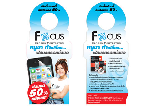 นายอมรศักดิ์ เปิดเผยเพิ่มเติมถึงโปรโมชั่นฟิล์มกันรอยโฟกัสว่า ได้จัดแคมเปญมอบส่วนลด 50% ผ่านช่องทางสื่อของ MRT เพื่อให้ลูกค้าหยิบเอกสารโปรโมชั่นมาใช้เป็นส่วนลดและสามารถแลกซื้อฟิล์มกันรอย Focus สำหรับฟิล์มลดรอยทั้งแบบใสและแบบด้านที่มีให้เลือกซื้อเพื่อใช้กับโทรศัพท์สมาร์ทโฟน ซึ่งถือว่าเป็นโปรโมชั่นที่น่าจะโดนใจผู้ที่มาซื้อโทรศัพท์มือถือในงานดังกล่าว สามารถหยิบคูปองโปรโมชั่นเพื่อแลกซื้อได้ที่จุดแขวน Hanger บนรถไฟฟ้า MRT แล้วอย่าลืมมาใช้สิทธิ์ส่วนลดได้ที่ Focus บูธ M1 ณ ศูนย์การประชุมแห่งชาติสิริกิติ์