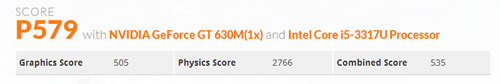 ผลทดสอบประสิทธิภาพกราฟิกอินทิเกรตด้วย 3DMark11 ได้ 579 คะแนน