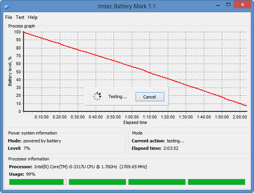 ทดสอบด้วยการชาร์จแบตเตอรี่ให้เต็ม 100% และทดสอบด้วยโปรแกรม Imtec Battery Mark 1.1 โดยการทดสอบด้วยการให้ซีพียูทำงานเต็มประสิทธิภาพ 100% ผลการทดสอบสามารถใช้งานแบตเตอรี่ได้นานประมาณ 2 ชั่วโมง เลยทีเดียว