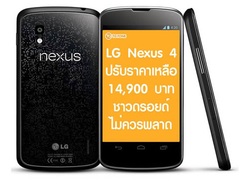 ข่าวดีสำหรับสาวกแอนดรอยด์ที่ต้องการเป็นเจ้าของสมาร์ทโฟนดีไซน์หรูหรา โดดเด่นด้วยฝาหลังเปร่งประกายเมื่อกระทบแสงอย่าง "LG Nexus 4" เมื่อ TG Fone ประกาศลดราคาเหลือเพียง 14,900 บาท โดยมีให้เลือกทั้งหมด 2 สี คือ สีขาว และสีดำ