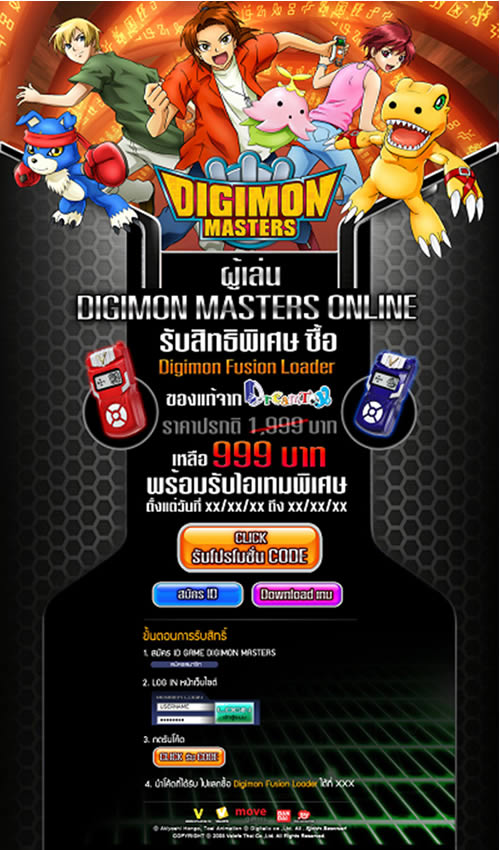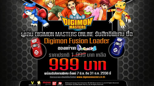 บริษัท เวโลฟ ไทย จำกัดผู้ให้บริการเกมดิจิมอน มาสเตอร์ ออนไลน์ผสานกำลังร่วมกับบริษัท ดรีมทอยส์ จำกัดผู้นำเข้าเครื่องเล่นอย่างถูกลิขสิทธิ์จาก BANDAI มอบส่วนลดพิเศษให้แฟนคลับเกมดิจิมอน มาสเตอร์ ออนไลน์ สามารถสั่งซื้อเครื่องเล่น Digimon Fusion Loader จากปกติ 1999 บาท เหลือเพียง 999 บาทเท่านั้น พร้อมรับไอเทมโค๊ดจากเกมดิจิมอน ฟรี