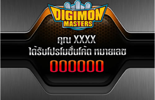 1.เข้าหน้าเว็บไซต์ www.digimonmasters.in.th คลิกที่ Banner เพื่อรับ โปรโมชั่นโค๊ด (สำหรับผู้ที่ยังไม่มี ID เกมดิจิมอนฯ สามารถลงทะเบียนเพื่อสมัครได้ที่หน้าเว็บไซต์ทันที)