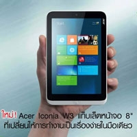 Acer ICONIA W3 วินโดวส์แท็บเล็ตขนาด 8 นิ้ว ที่ย่อการทำงานและความบันเทิงไว้ในมือเดียว ด้วยระบบปฎิบัติการ Windows 8 หน้าจอ LCD ระบบสัมผัส Multi-Touch ความละเอียด 1280x800 พิกเซล ผสานการทำงานเทคโนโลยีจาก Intel Processor Z2760 แบบ Dual-Core ความเร็ว 1.8GHz แรม 2 GB หน่วยความจำ 32 GB รองรับ microSD สูงสุด 32GB กล้องหน้าและด้านหลังความละเอียด 2 ล้านพิกเซล แบตเตอรี่ใช้งานสูงสุด 8 ชั่วโมง น้ำหนักเพียง 540 กรัม (ไม่รวมชุดคีย์บอร์ด) วางจำหน่ายในราคา 12,900 บาท (รวมภาษีมูลค่าเพิ่ม) พร้อมติดตั้ง Microsoft Office Home & Student 2013 ในตัวเครื่อง