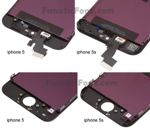 เมื่อพิจารณาจากแผงวงจรดิจิตอลและชิ้นส่วนหน้าจอ LCD แทบจะไม่เห็นความแตกต่างกัน ยกเว้นความยาวของสายแพที่ต่างกันเล็กน้อย หน้าจอทั้งสองรุ่นมีขนาดเท่ากันเป๊ะ รวมถึงระยะห่างของขอบจอกับขอบเครื่องก็เท่ากัน บ่งชี้ว่าหน้าจอของ iPhone 5S จะเป็นแบบเดียวกับ iPhone 5 แต่ขนาดของสายแพที่ยาวขึ้นก็บ่งชี้ได้ว่าภายในตัวเครื่อง iPhone 5S มีการออกแบบที่แตกต่างจาก iPhone 5 อยู่ไม่น้อย