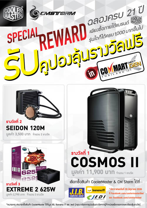 Cooler Master & Cm Storm ฉลองครบรอบ 21 ปี จัดโปรโมชั่นซื้อสินค้าภายใต้แบรนด์ รุ่นใดก็ได้ครบ 1,000 บาทขึ้นไป รับคูปองเพื่อลุ้นรับรางวัลฟรี ในงาน Commart X Gen 2013 วันที่ 20-23 มิถุนายนนี้ ณ ศูนย์ประชุมแห่งชาติสิริกิติ์