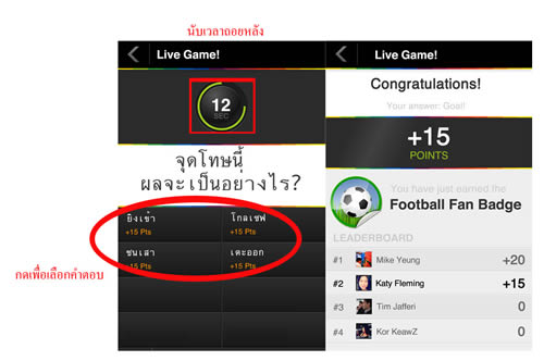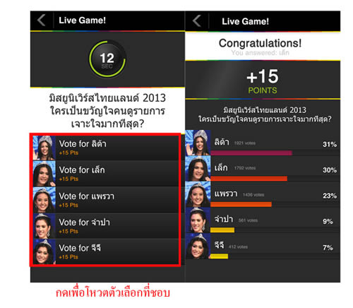 Live Game เกมส์2 รูปแบบที่ให้ร่วมลุ้นตอบคำถาม เหมือนได้เข้าไปอยู่ในรายการโทรทัศน์ มีคำถามให้ร่วมสนุกทั้ง Quiz และ Poll ตอบกันแบบสดๆ ไปพร้อมกับรายการบน โทรทัศน์ เพียงแค่กด CHECK-IN และก็รอคำถามที่ถูกส่งเข้ามาให้ร่วมสนุกกัน