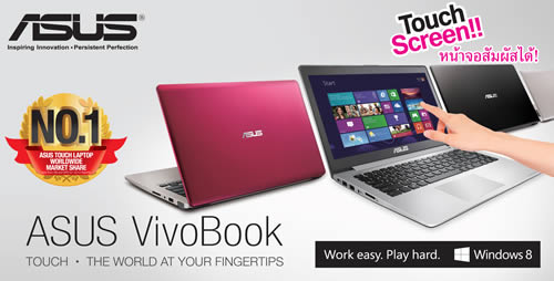 นำทัพมาโดย “ASUS VivoBook” หน้าจอระบบสัมผัส บนระบบปฎิบัติการ Windows 8 เพื่อสร้างความประทับใจแก่ผู้บริโภคตั้งแต่แรกที่ได้สัมผัส รูปโฉมเพรียวบาง ขนาดกะทัดรัด พกพาสะดวก ด้วยลูกเล่นที่หลากหลายและการใช้งานที่แสนง่ายดาย สามารถรีซูมระบบได้ภายใน 2 วินาทีจาก sleep mode แม้จะพักเครื่องไว้นานแล้วก็ตาม ด้วยดีไซน์หรูหราสะกดทุกสายตา ราคาเริ่มต้น 13,900 บาท (รวมภาษีมูลค่าเพิ่ม)