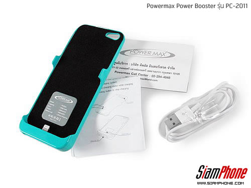 Powermax Power Booster รุ่น PC-2001 มาในโทนสีเขียวสดใส ที่ด้านหลังตัวเคส Powermax Power Booster รุ่น PC-2001 มาพร้อมขาตั้ง และมีปุ่มเปิด/ปิด การใช้งาน หรือใช้เช็คสถานะไฟมือถือว่าเพียงพอต่อการใช้งานหรือไม่ เมื่อเริ่มการชาร์จหน้าจอ iPhone 5 จะแสดงสถานะการชาร์จสีแดงดวงแรกจะติด 1 ดวง และเมื่อชาร์จไฟเต็มไฟสีฟ้าจะติดค้าง 4 ดวง แสดงระดับของแบตเตอรี่เต็ม