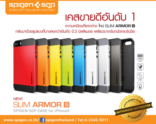 SpigenSGP ปล่อยเคสตัวใหม่ล่าสุด "Slim Armor S" รองรับการใช้งานร่วมกับ iPhone 5 เป็นตัวอัพเกรดมาจาก Slim Amor ซึ่งจะบางลงกว่าเดิม 0.3 มิลลิเมตร เพื่อให้รู้สึกจับถนัดและกระชับมือมากขึ้น แต่ยังคงปกป้อง 2 ชั้นจากตัวเครื่องเหมือนเดิม