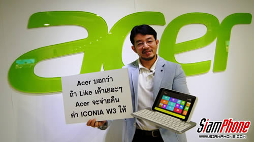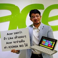 บริษัท เอเซอร์ คอมพิวเตอร์ จำกัด เปิดตัวกิจกรรม “Like me ACER ใจดีจ่ายให้” กิจกรรมสุดคุ้มเพื่อตอบแทนและคืนกำไรให้กับลูกค้าที่ซื้อ ICONIA | W3 แท๊ปเล็ต Windows 8 ขนาดหน้าจอ 8.1” เครื่องแรกในประเทศไทยที่นำประสิทธิภาพคอมพิวเตอร์มาใส่ในแท๊ปเล็ตให้คุณสนุกกับหน้าจอสัมผัส ทำงาน เล่นเกมส์ เล่นเน็ท เฟสบุ๊ก ดูหนัง ฟังเพลง และสะดวกในการพกพาไปได้ทุกที่