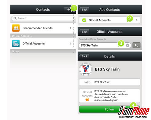ถ้าไม่อยากพลาดการเดินทางกับรถไฟฟ้าบีทีเอส รีบโหลด WeChat และติดตาม Official Account กันเลยวันนี้ ง่ายๆ เพียงเข้าไปที่หน้าเพียงเข้าไปที่หน้า “เพิ่มผู้ติดต่อ” (Add Contacts) และกดปุ่มบวกที่มุมขวาบน จากนั้นกดเลือก Official Account พิมพ์ “BTS SkyTrain” แล้วกดติดตาม (Follow) เพียงเท่านี้ ไม่ว่าเดินทางไกลแค่ไหนคุณก็สามารถอัพเดทความเคลื่อนไหวของ BTS ได้ก่อนใคร