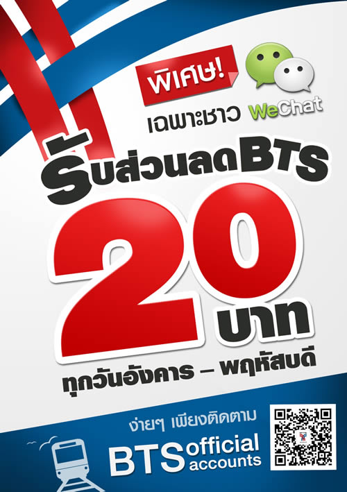 WeChat โซเชียลแอพพลิเคชั่นบนอุปกรณ์มือถือยอดนิยม เอาใจคนกรุง นักเรียน นักศึกษาและหนุ่มสาววัยทำงานที่ใช้ชีวิตอยู่กับการเดินทาง ด้วยการจับมือบริษัท ระบบขนส่งมวลชนกรุงเทพ จำกัด (มหาชน) ผู้ให้บริการรถไฟฟ้าบีทีเอส เปิดตัว “BTS SkyTrain Official Account” อีกหนึ่งช่องทางการสื่อสารในยุคโซเชียลเน็ตเวิร์คส่งตรงจากบีทีเอส ให้ผู้ใช้งานสามารถตรวจสอบเส้นทาง ประเภทตั๋วโดยสาร ราคา เช็คเวลาเดินทาง รวมทั้งอัพเดทข่าวสารโปรโมชั่น ได้สะดวกรวดเร็วทุกที่ทุกเวลาผ่าน Official Account ได้ทันที และพิเศษสุดๆ สำหรับผู้ใช้งาน WeChat รับส่วนลดมูลค่า 20 บาททันที* เมื่อซื้อบัตรโดยสาร, เติมเงิน หรือเติมเที่ยวเดินทางเพื่อโดยสารรถไฟฟ้าบีทีเอสตั้งแต่ 300 บาทขึ้นไป ในทุกวันอังคาร – พฤหัสบดี โดยรับส่วนลดได้ตั้งแต่วันนี้ถึงวันที่ 31 มกราคม 2557