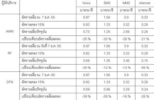 นายฐากร ตัณฑสิทธิ์ เลขาธิการคณะกรรมการกิจการกระจายเสียง กิจการโทรทัศน์ และกิจการโทรคมนาคมแห่งชาติ (เลขาธิการ กสทช.) กล่าวว่า สำนักงาน กสทช. ได้ทำการติดตามตรวจสอบและกำกับค่าบริการสำหรับกิจการโทรคมนาคมเคลื่อนที่สากลย่านความถี่ 2.1 GHz หรือ 3G บนคลื่น 2.1 GHz ตามเงื่อนไขใบอนุญาตประกอบกิจการโทรคมนาคมแบบที่สาม หมวด 3 เงื่อนไขเฉพาะสำหรับผู้รับใบอนุญาต ภาคผนวก ก ข้อ 7.5 ที่กำหนดให้ “ผู้รับใบอนุญาตจะต้องกำหนดอัตราค่าบริการให้เป็นธรรม สมเหตุสมผลและไม่เอาเปรียบผู้บริโภค โดยในการเปิดให้บริการผู้รับใบอนุญาตจะต้องกำหนดอัตราค่าบริการที่ลดลงโดยเฉลี่ยไม่น้อยกว่าร้อยละสิบห้าของอัตราค่าบริการเฉลี่ยของบริการประเภทเสียง (voice) และบริการที่ไม่ใช่ประเภทเสียง (non-voice) ที่มีการให้บริการอยู่ในตลาด ณ วันที่ได้รับใบอนุญาต (วันที่ 7 ธันวาคม 2555)