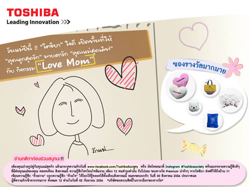 วันแม่ปีนี้ !! “โตชิบา” ใจดี เปิดพื้นที่ให้ “คุณลูกสุดรัก” มาบอกรัก “คุณแม่สุดเลิฟ” ในกิจกรรม “Love Mom”เพียงคุณถ่ายรูปคู่กับคุณแม่สุดรัก แล้วมาอวดความรักกันที่ www.facebook.com/ToshibaSociety หรืออัพโหลดมาที่ Instagram #Toshibasociety พร้อมบรรยายความรู้สึกดีๆ ที่มีต่อคุณแม่ของคุณ ความรู้สึกใครโดนใจทีมงาน เพียง 12 ท่านเท่านั้น รับไปเลยของรางวัลน่ารักๆ จากโตชิบา ส่งฟรีให้ถึงบ้าน !!!