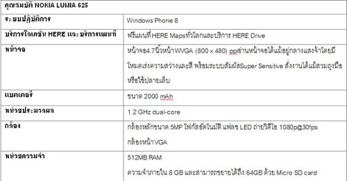 Nokia Lumia 625 มากับหน้าจอสัมผัส Super Sensitive หน่วยความจำ 8 GB ขยายได้ถึง 64GB ด้วย Micro SD card พร้อมกล้องหลักขนาด 5 เมกะพิกเซลแฟลช LED และกล้องหน้า VGA รองรับ 3G วางจำหน่ายแล้วในราคา 8,990 บาท ข้อมูลเพิ่มเติมคลิก http://www.nokia.co.th/lumia625