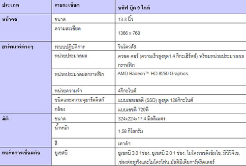 Samsung นำเสนอ “ATIV Book 9Lite” โน้ตบุ๊กบางพิเศษที่มาพร้อมระบบปฏิบัติการวินโดวส์ 8 ส่วนผสมที่ลงตัวระหว่างรูปลักษณ์ที่โดดเด่นและนวัตกรรมล้ำสมัยนอกเหนือจากดีไซน์เหนือระดับ ซัมซุงอทีฟ บุ๊ค 9 ไลท์ยังเต็มเปี่ยมด้วยประสิทธิภาพในการใช้งานกับหน้าจอทัชสกรีนขนาด 13.3 นิ้ว ที่รองรับการสัมผัสได้ถึง 10 จุด หน่วยประมวลผลแบบควอดคอร์ (Quad-Core Processor 1.4GHz) หน่วยความจำ 4 กิกะไบต์ (4GB) และหน่วยจัดเก็บข้อมูลแบบ SSD (Solid State Disk) ความจุ 128 กิกะไบท์ (128GB) อีกทั้งยังพกพาสะดวกด้วยน้ำหนักเพียง 1.58 กิโลกรัม และบางเพียง 17.4 มิลลิเมตร