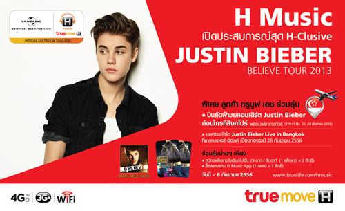 H Music จัดแคมเปญเอาใจสาวกนักร้องซุปตาร์วัยทีน Justin Bieber ลุ้นรางวัลใหญ่บินไปแดนซ์ในคอนเสิร์ต “Justin Bieber – Believe Tour 2013” ที่สิงคโปร์ในวันที่ 23 กันยายน 2556 พร้อมแพคเกจทัวร์ และรางวัลสุดพิเศษ บัตรชมคอนเสิร์ต Justin Bieber – Believe Tour 2013 ที่กรุงเทพฯ ในวันที่ 26 กันยายน 2556 นอกจากนี้ยังมีสิทธิ์ลุ้นเข้าร่วม “Meet & Greet กับ Justin Bieber” อีกด้วย รวมมูลค่าของรางวัลกว่า 500,000 บาท
