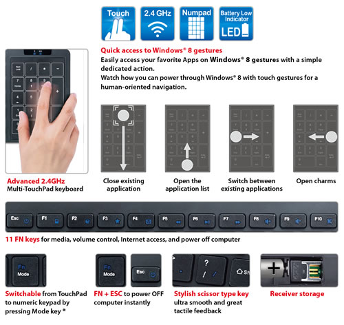 สัมผัสประสบการณ์กับระบบปฏิบัติการ Windows 8 ด้วยคีย์บอร์ดพร้อมทัชแพดในตัวจาก Genius SlimStar T8020 ด้วยตัวคีย์บอร์ดมัลติทัชไร้สายใช้งานบนคลื่นความถี่ 2.4GHz ที่จะทำให้การเชื่อมต่อนั้นราบรื่นไร้การรบกวน SlimStar T8020 ยังทำให้คุณสามารถเปลี่ยนใช้งานได้ถึง 3 โหมด อันได้แก่ Mouse Cursor, Windows 8 Gestures และ Numeric Keypad เพียงแค่กดปุ่มคำว่า MODE โดยที่ตัวทัชแพดมัลติทัช จะสามารถทำให้ใช้งาน Windows 8 Gestures เช่นการ slide, swipe หรือ pinch zoom และ page up/down โดยไม่ต้องลงไดร์เวอร์ใดๆเพิ่มเติม