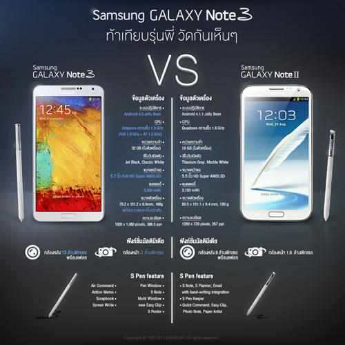 ต่อเนื่องจากกระแส Samsung Galaxy Note 3 ซึ่งเปิดตัวไปเมื่อคืนวันที่ 4 กันยายน ณ กรุงเบอร์ลินที่ผ่านมา หลายคนจับตามองว่า Samsung Galaxy Note 3 จะสามารถครองใจผู้ใช้งานสมาร์ทโฟนแอนดรอยด์ได้เหมือนเช่นรุ่นก่อนหน้าอย่าง Samsung Galaxy Note 2 หรือไม่ รวมทั้งมีอะไรเพิ่มเติมขึ้นมาบ้าง เรามีภาพอินโฟกราฟิกเปรียบเทียบ Samsung Galaxy Note 3 vs Samsung Galaxy Note 2 มาให้ชมกันแบบชัดๆ ว่ามีการเปลี่ยนแปลงอะไรใหม่บ้าง