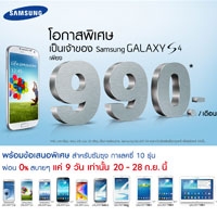 Samsung เปิดโอกาสให้คุณเป็นเจ้าของ Samsung Galaxy S4 ง่ายๆ ผ่อนเพียง 990 บาทต่อเดือน พร้อมข้อเสนอพิเศษสำหรับซัมซุง กาแลคซี่ 10 รุ่น ผ่อน 0% นานสุด 24 เดือน โปรโมชั่นพิเศษนี้ จัดขึ้นเพียง 9 วัน 20-28 กันยายนนี้เท่านั้น