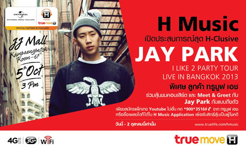 ธีรศักดิ์ อรุณเริ่มวัฒนะ รองผู้อำนวยการด้านบริหารแบรนด์ และการสื่อสารเพื่อสร้างแบรนด์ บริษัททรู คอร์ปอเรชั่น จำกัด (มหาชน) กล่าวว่า “H Music มีการทำการตลาดที่หลากหลาย เพื่อให้สอดคล้องกับไลฟ์สไตล์ความบันเทิงของคนทุกวัย ทางเราเล็งเห็นว่ากระแสเพลง K-Pop ในตลาดวัยรุ่นไทยยังคงเป็นที่นิยมมาอย่างต่อเนื่อง เราจึงตั้งใจจัดแคมเปญนี้ขึ้นมาเพื่อเอาใจลูกค้าทรูมูฟ เอช ที่นิยมศิลปินเกาหลีโดยเฉพาะ โดยลูกค้าสามารถร่วมลุ้นเป็นผู้โชคดีรับบัตรคอนเสิร์ตที่นั่งที่แพงที่สุดมูลค่า 6,000 บาท ที่มาพร้อมสิทธิพิเศษในการเข้ากระทบไหล่เพื่อ Meet & Greet กับ Jay Park แบบถึงตัว จำนวน 2 รางวัลๆ ละ 2 ใบ และบัตรมูลค่า 4,500 บาท 7 รางวัลๆ ละ 2 ใบ ง่ายๆ เพียงสมัครแพคเกจ “Youtube ไม่อั้น” จากทรูมูฟ เอช โดยกด *900*3516 # แล้วกดโทรออก หรือ ซื้อเพลงจากศิลปินใดก็ได้ใน H Music App ตั้งแต่วันนี้ ถึง 2 ตุลาคม 2556 โดยสามารถตรวจสอบรายชื่อผู้โชคดี และติดตามรายละเอียดเพิ่มเติมได้ทาง www.truelife.com/hmusic